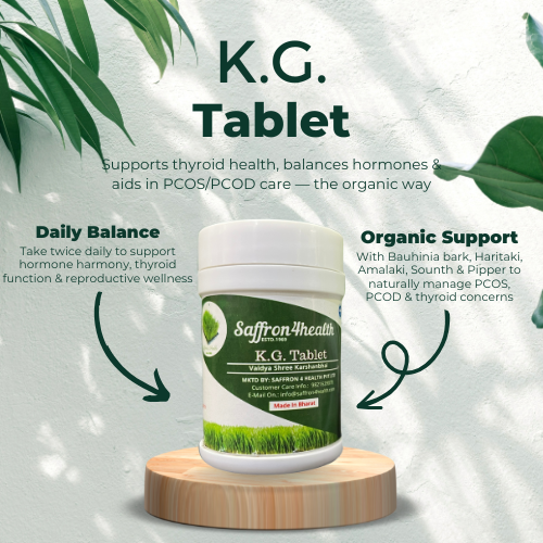 Regain control over hormonal imbalances with K.G. Tablets – a thoughtfully crafted organic solution for managing conditions like thyroid dysfunction, PCOS, PCOD, tumors, and general hormonal irregularities. Formulated using traditional ingredients like Bauhinia stem bark, Haritaki, Amalaki, Sounth, and Pipper, these tablets work gently yet effectively to restore inner balance and vitality.