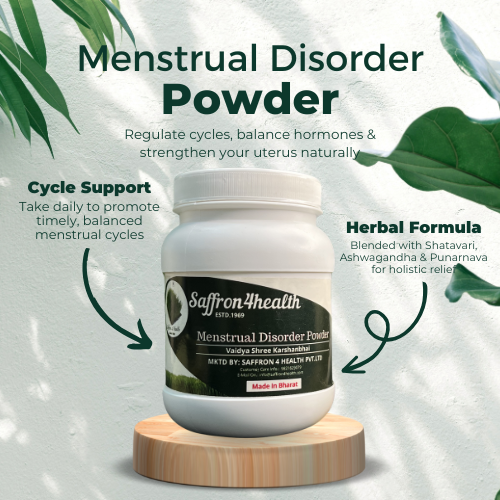 Saffron Healthy’s Menstrual Disorder Powder is a thoughtfully formulated herbal supplement designed to support women’s reproductive health. With a blend of time-tested Organic herbs like Shatavari, Ashwagandha, Triphala, and Punarnava, this powder helps regulate irregular menstrual cycles, balance hormones (estrogen & progesterone), and strengthen the uterus.