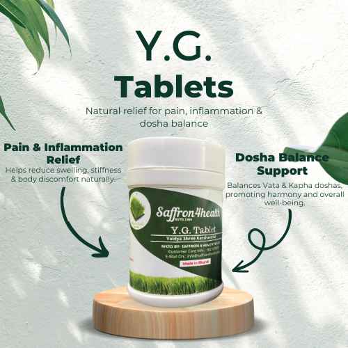 Y.G. Tablet is a natural herbal formulation designed to balance Vata and Kapha doshas, reduce inflammation, and provide effective pain relief. Enriched with powerful ingredients like Gokshru, Chitrak, Haritaki, Resna, Pippali, Cardamom, and Triphala, this tablet supports joint health, improves digestion, and enhances overall well-being.Its unique blend of herbs helps in relieving stiffness, swelling, and discomfort naturally without side effects. Regular use of Y.G. Tablet promotes healthy metabolism, strengthens immunity, and restores balance in the body.